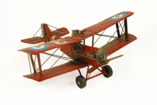 Reproducción avioneta antigua en color rojo de la primera guerra mundial, fabriada en metal y las ruedas en plastico.