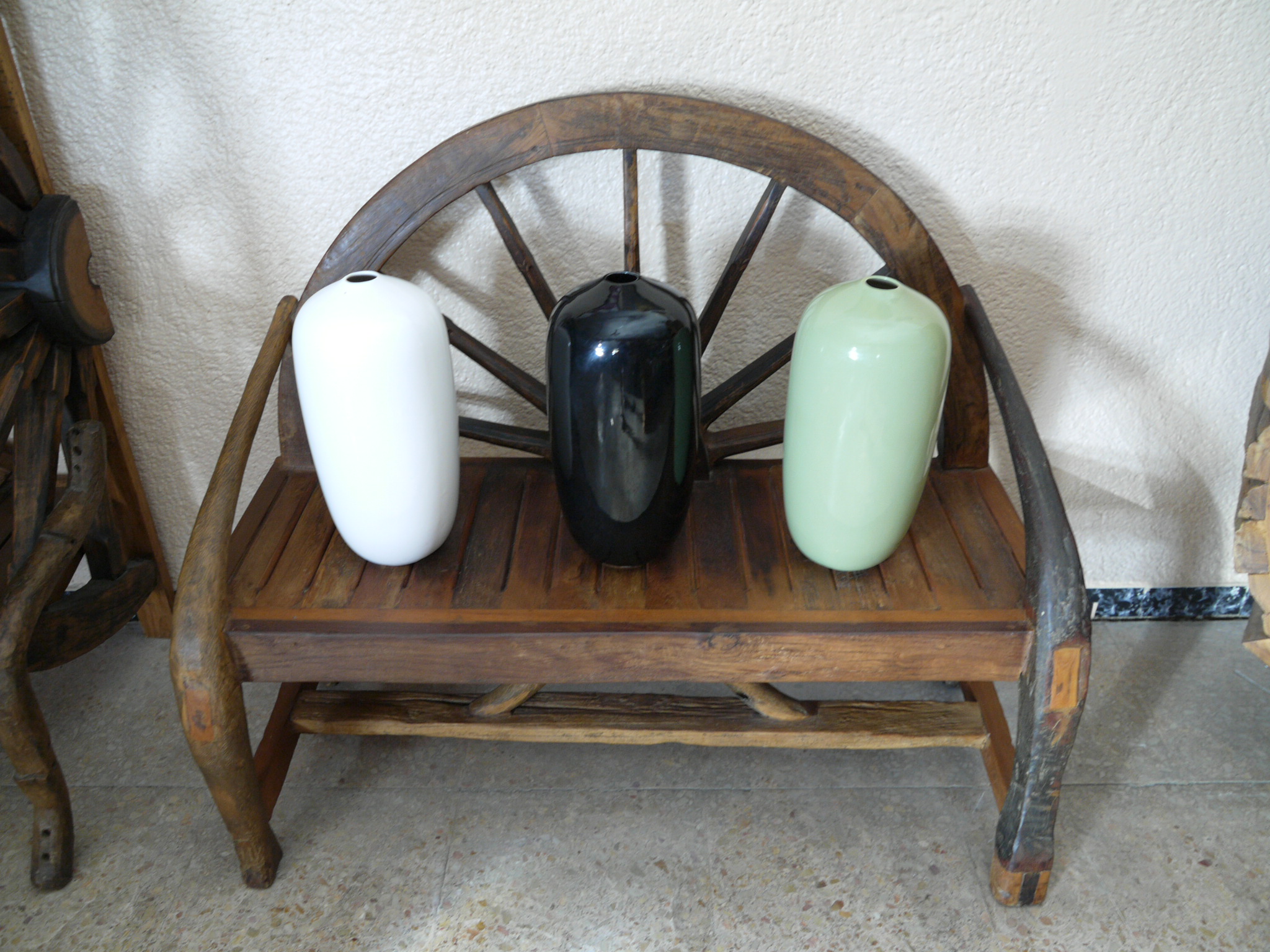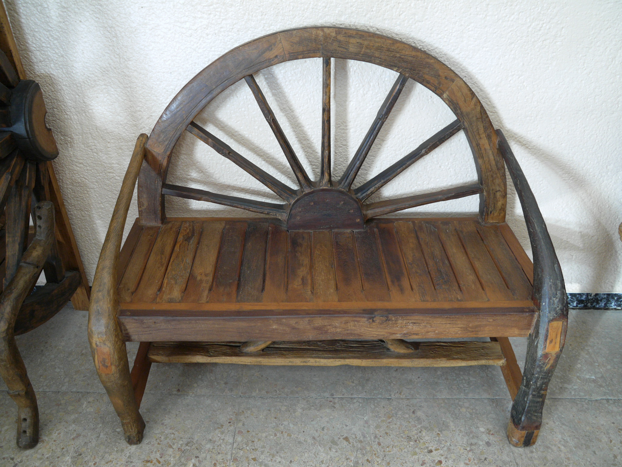 Banco madera rustico con respaldo de rueda de carro reciclada, para decorar una casa estilo rustico bodega y para jardin