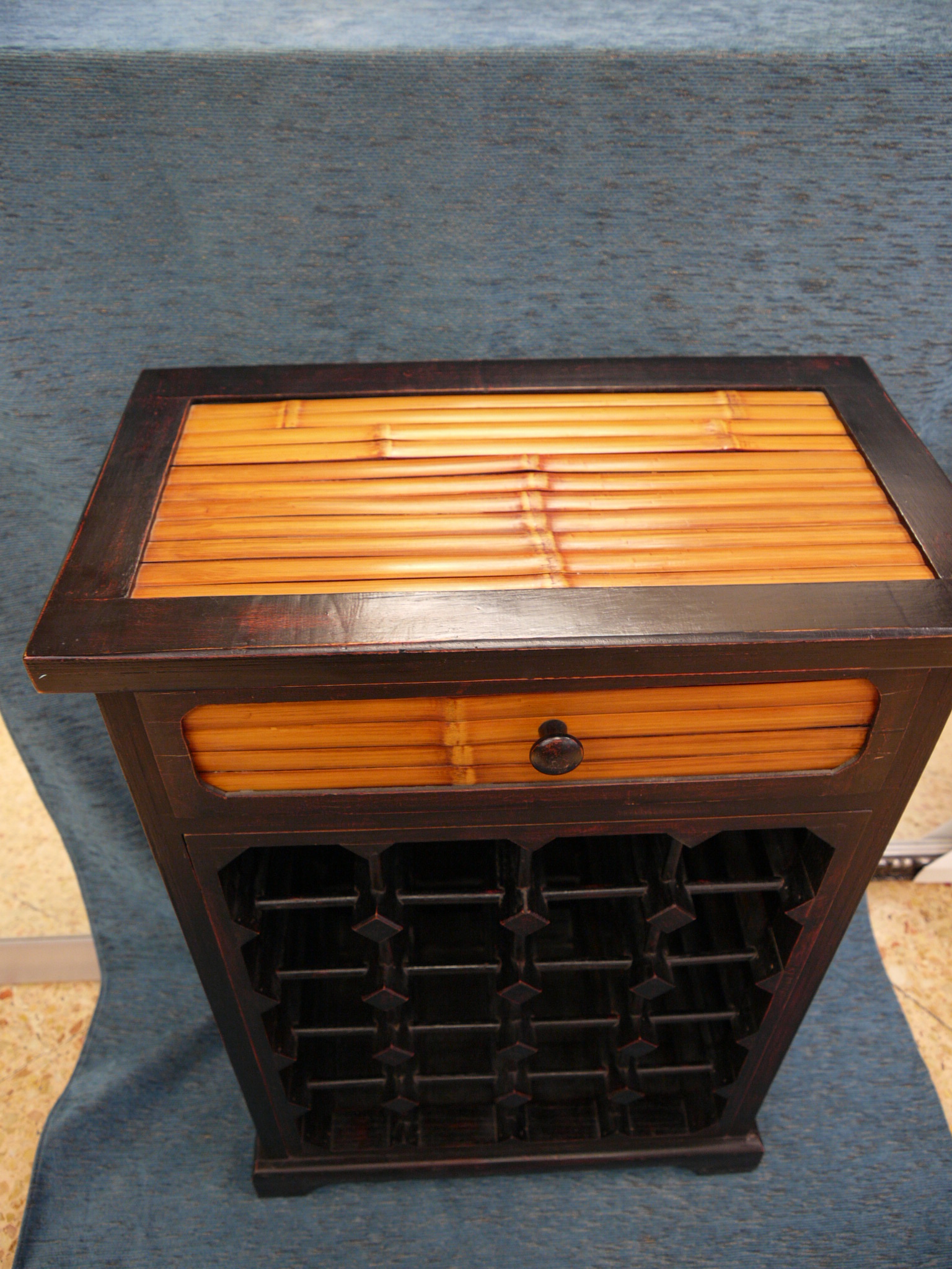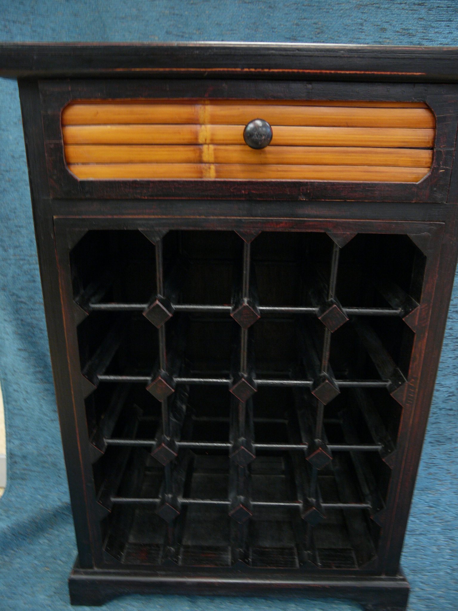 Botellero fabricado en madera combinaña con bambú, mezclando dos tonalidades, con medidas de 76 cm. de alto por 52 cm. de ancho por 30 cm. de profundo.