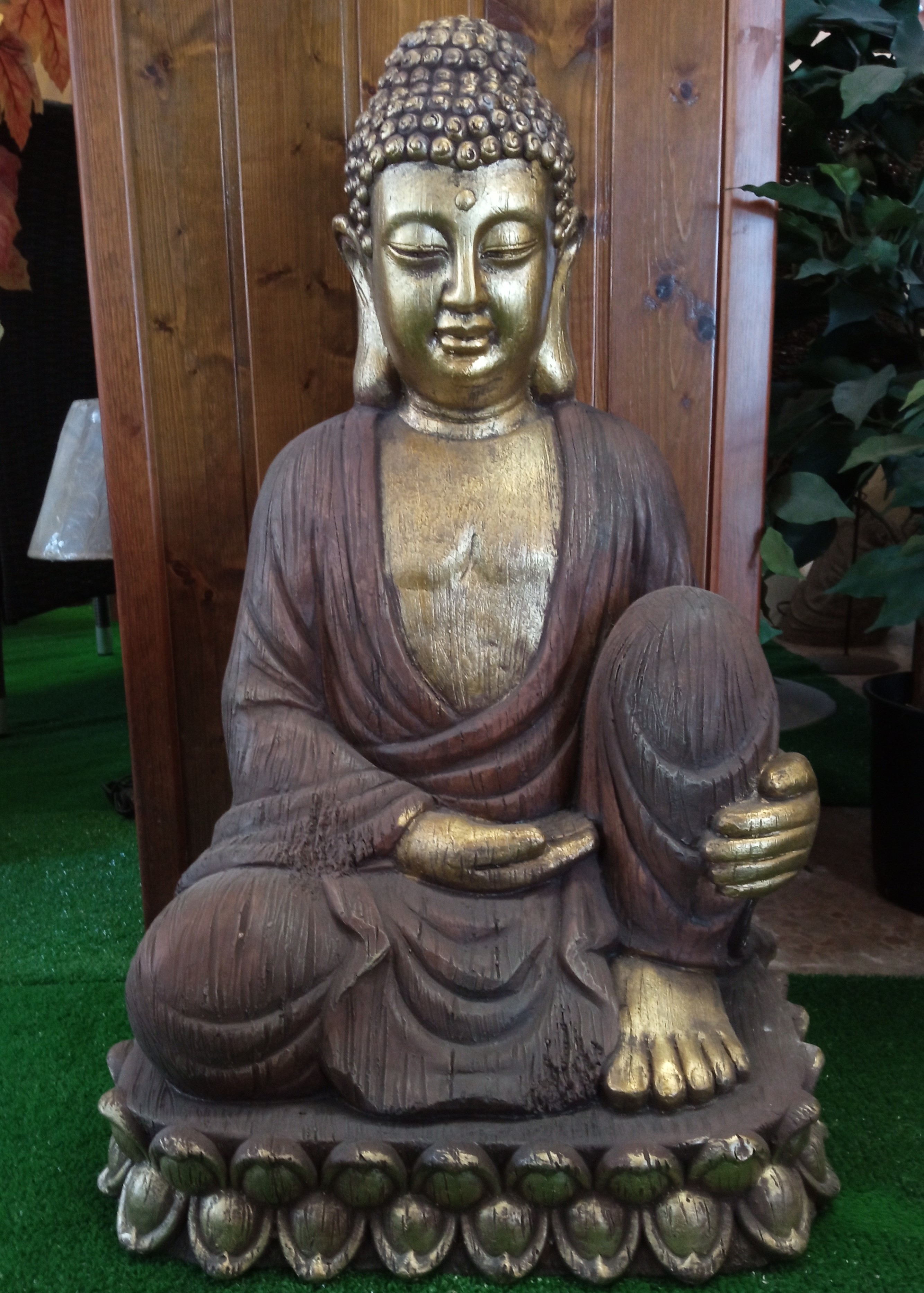 Decoratifa figura Buda sentado fabricado en fibrocemento con acabado en color dorado y marrón.