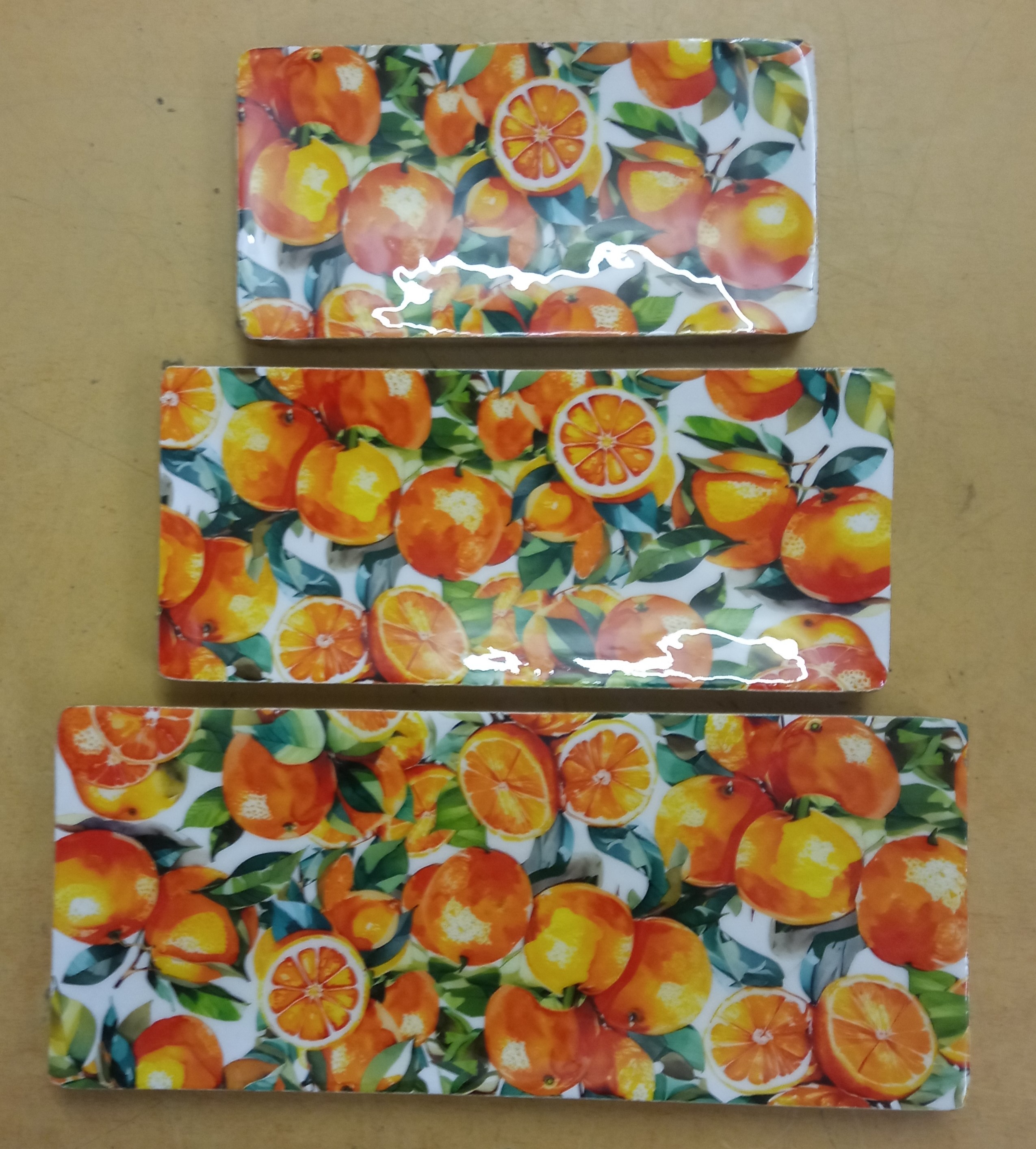 Conjunto 3 bandejas madera de mango decoradas con motivos de naranjas.