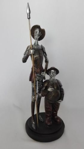 Figura Don quijote y Sancho Panza de pie, fabricada en resina con acabado envejecido.