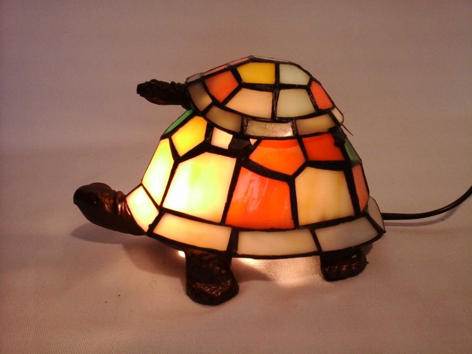 Lámpara tortuga con cría estilo Tiffany con pie metálico, utiliza bombillas de máximo 60w, no incluye bombilla.