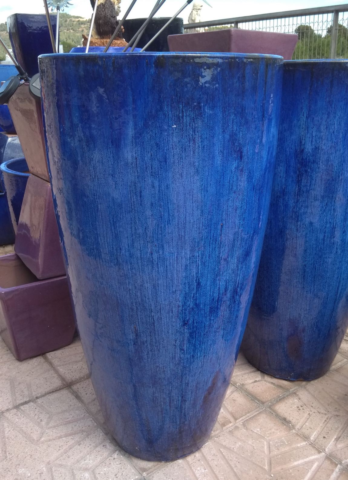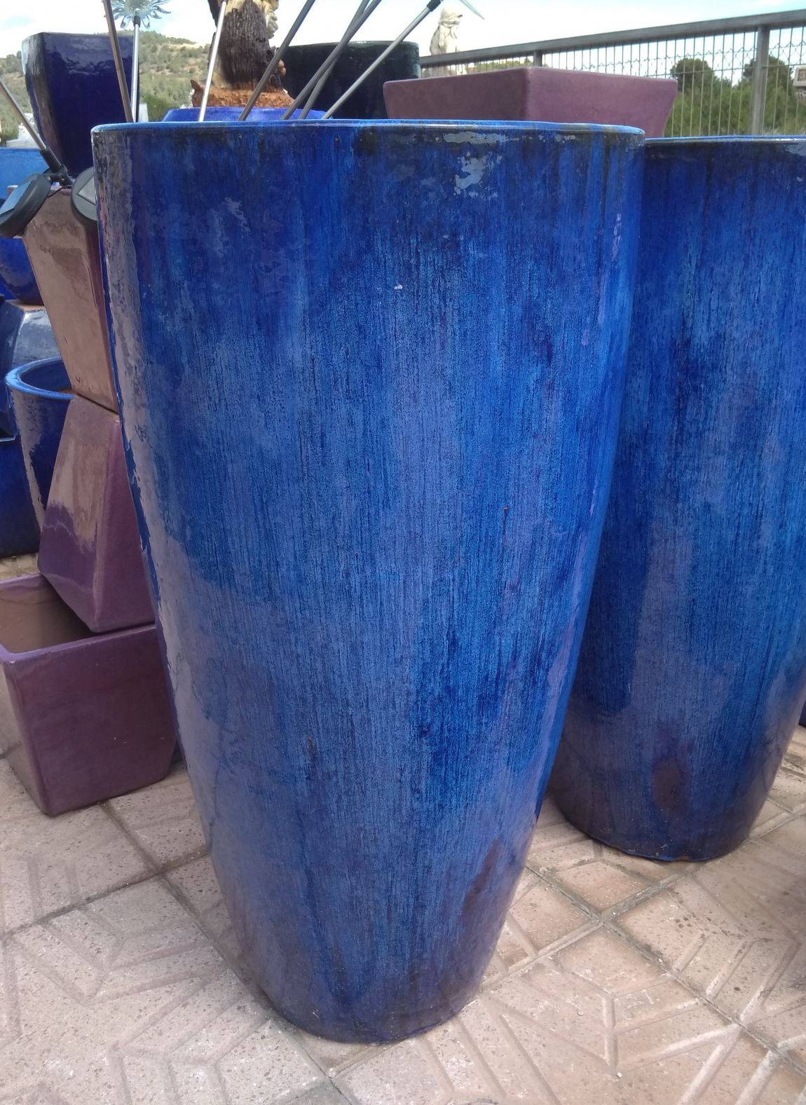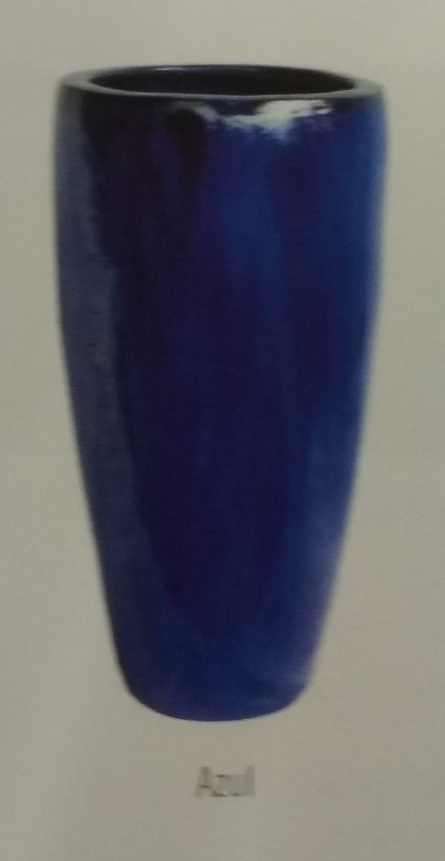 Maceta alta redonda fabricada en gres esmaltado en azul de gran resistencia a la intemperie. Disponible en dos tamaños de 93 cm. y 72 cm. de alura.
