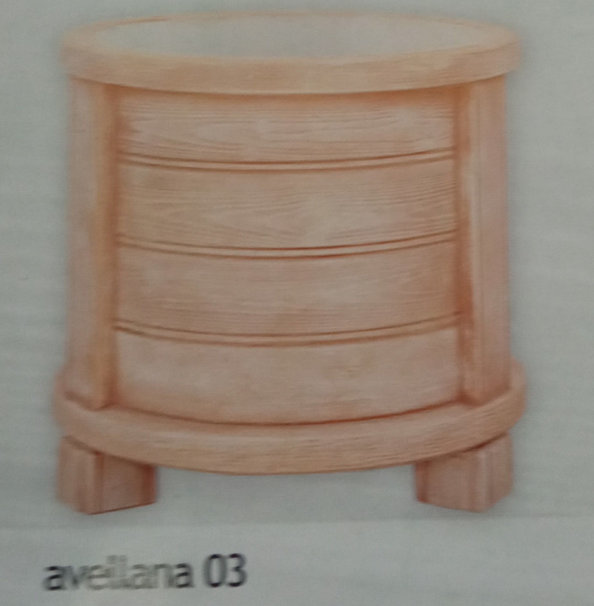 Maceta redonda modelo madera con tres pies, fabricada en piedra artificial resistente a la intemperie. Disponible en acabado avellana, gris, ocre, teja y verdoso.