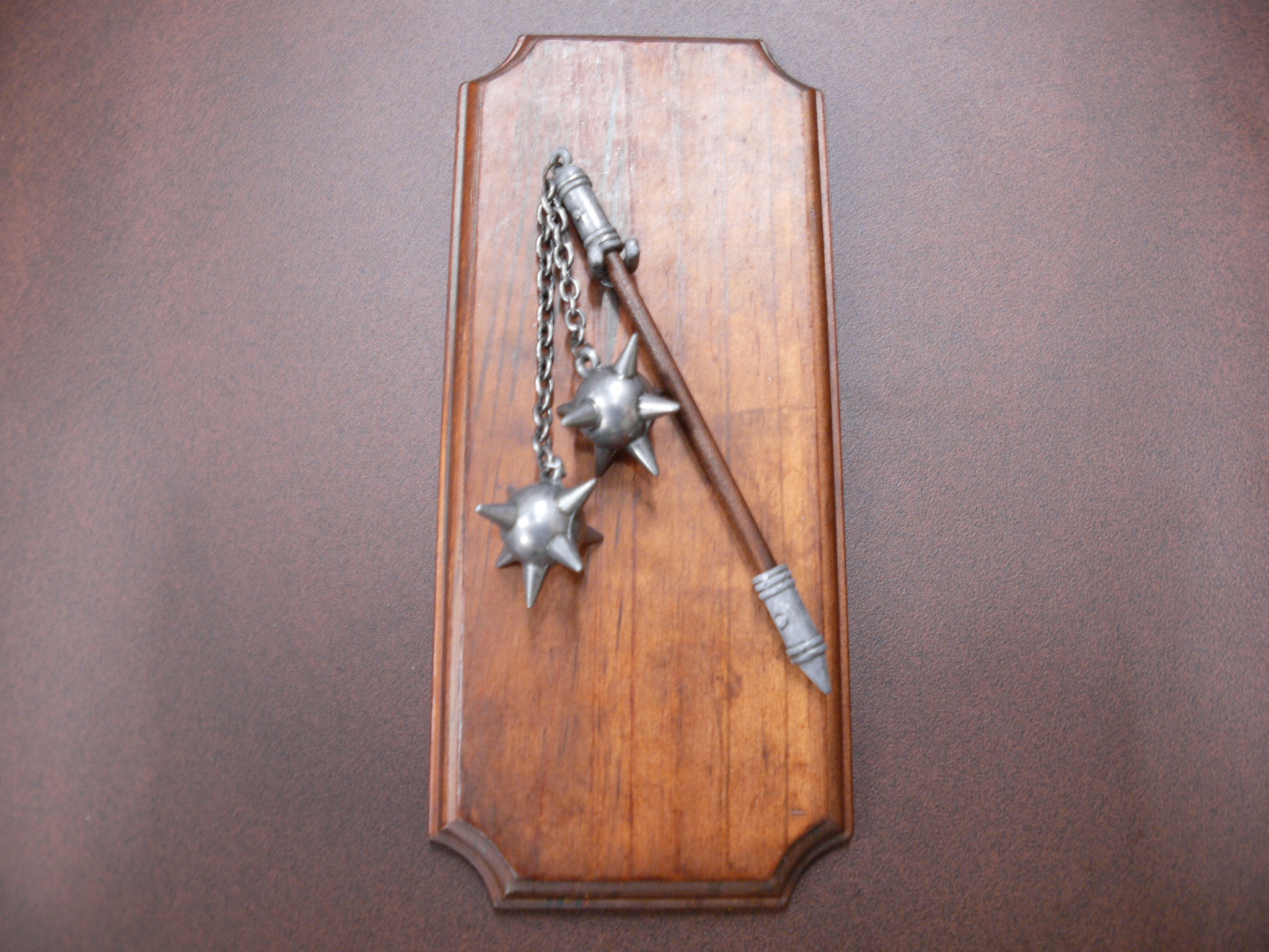 Panoplia pared con maza de dos bolas, fabricado en madera y fundicion de metal