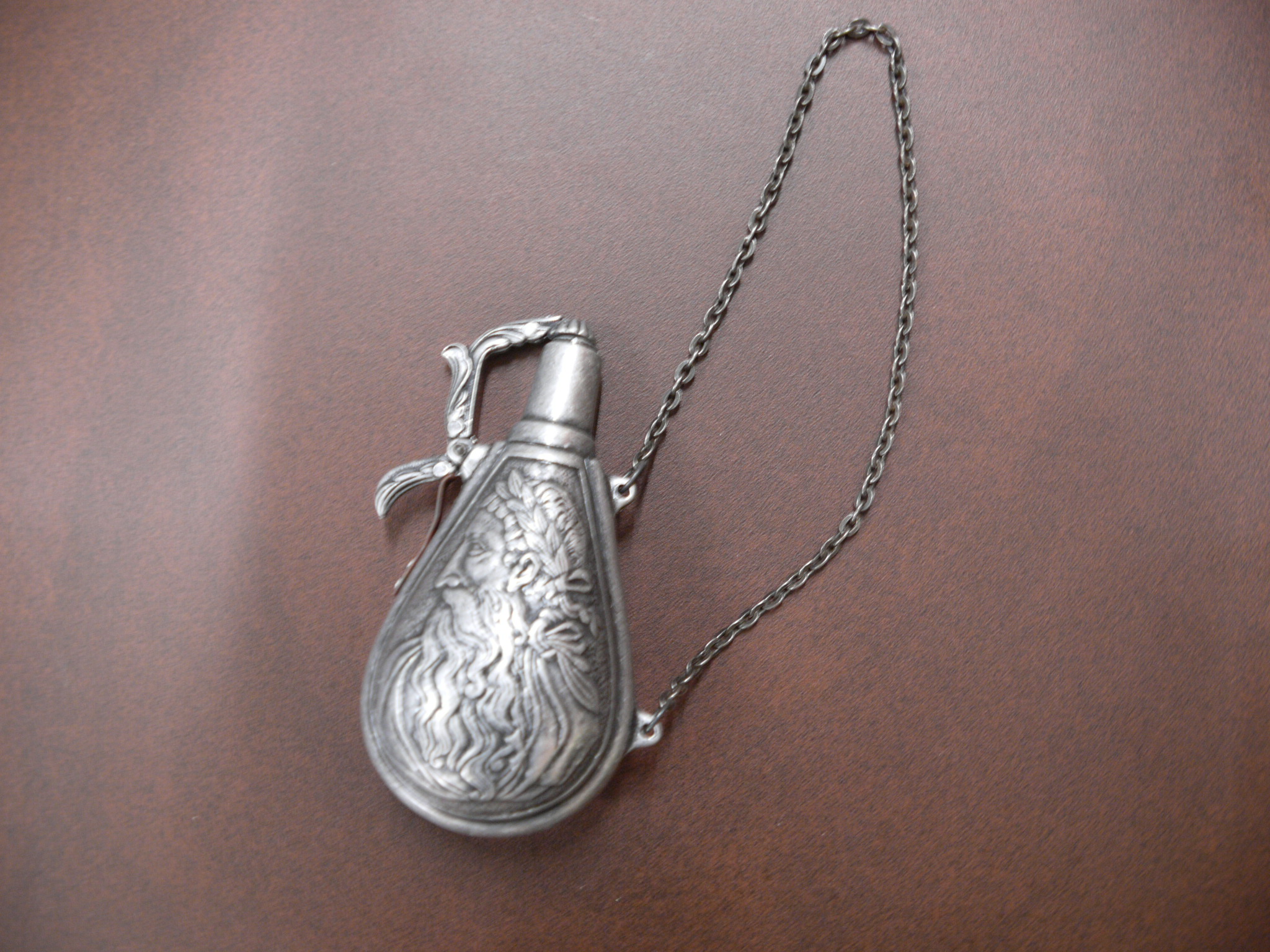 Rreproduccion polvorera antigua tipo saco realizada en aleacion de metal