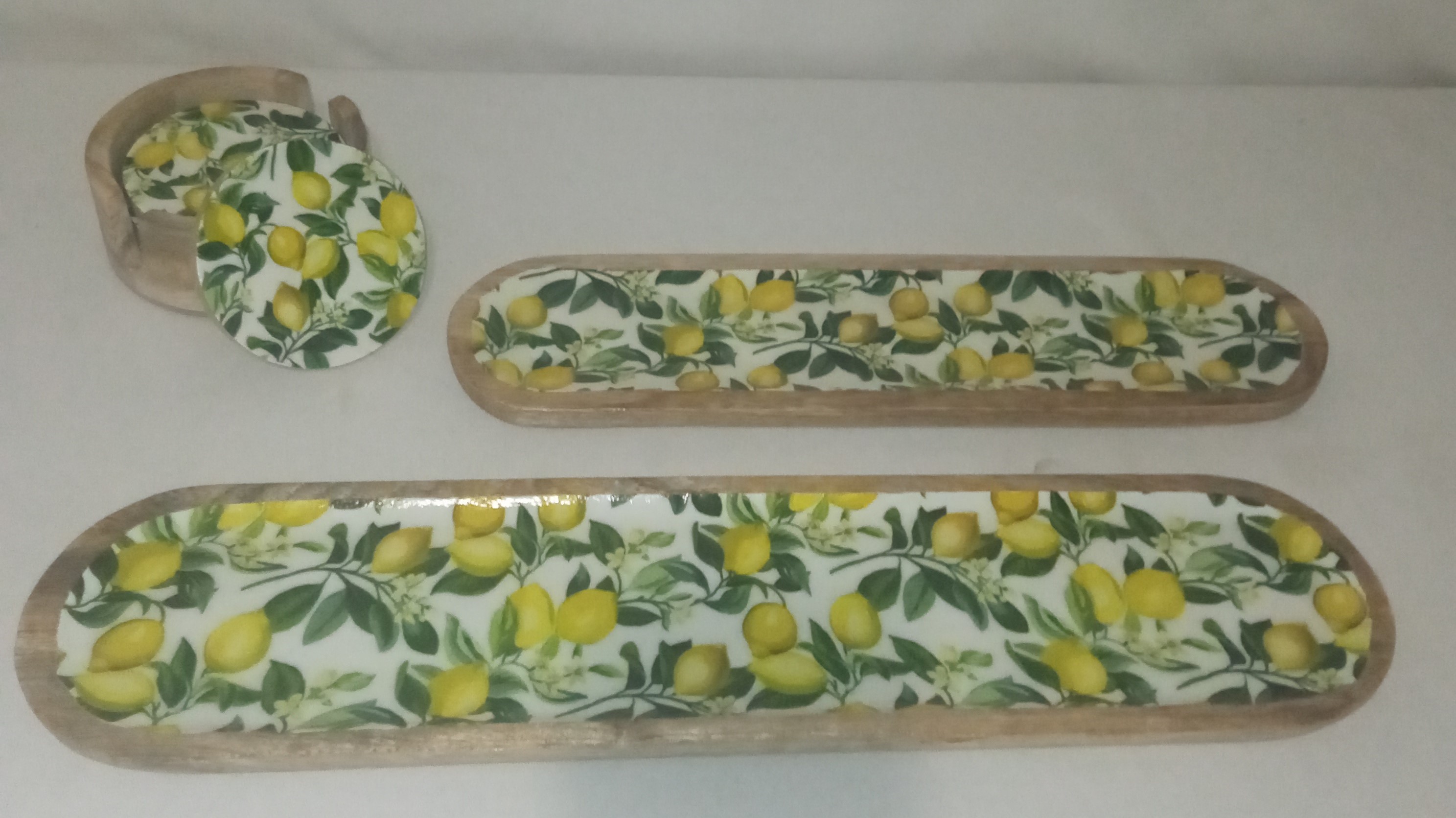 Set artículos de servicio de mesa, cocina fabricados en madera de mango decorados con motivos de limones.