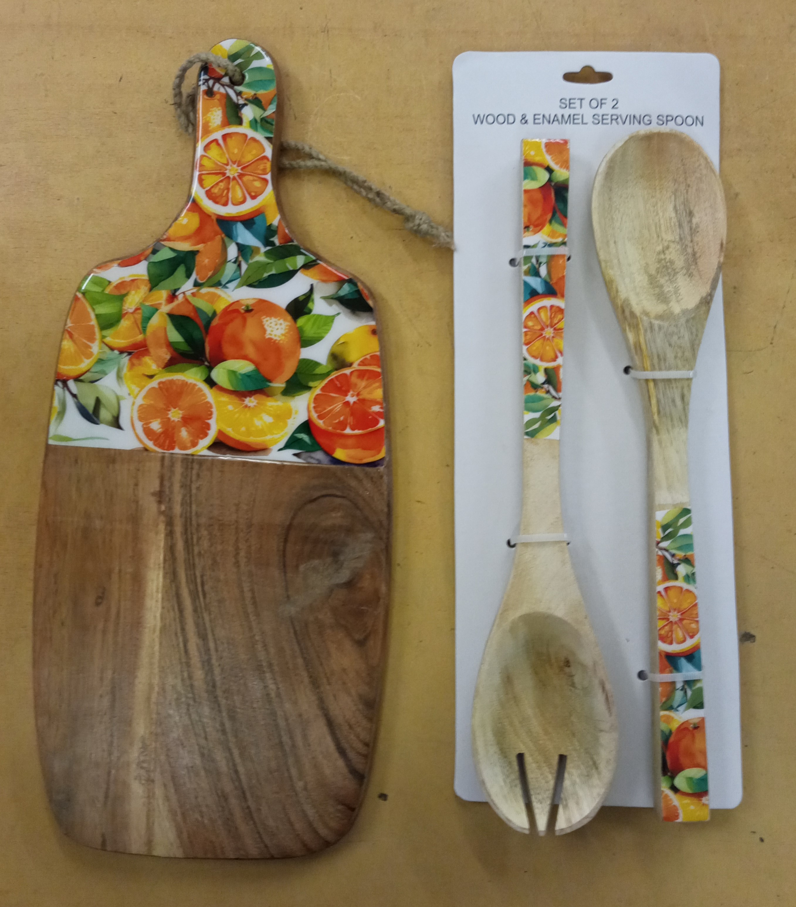 Set artículos de cocina fabricados en madera de mango decorados con motivos de naranjas.