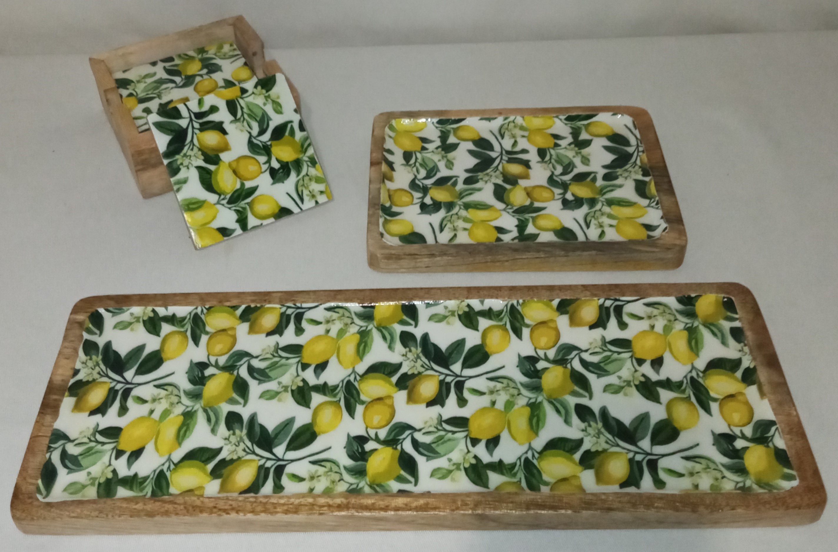 Set artículos cocina, servicio de mesa fabricados en madera de mango decorados con motivos de limones.