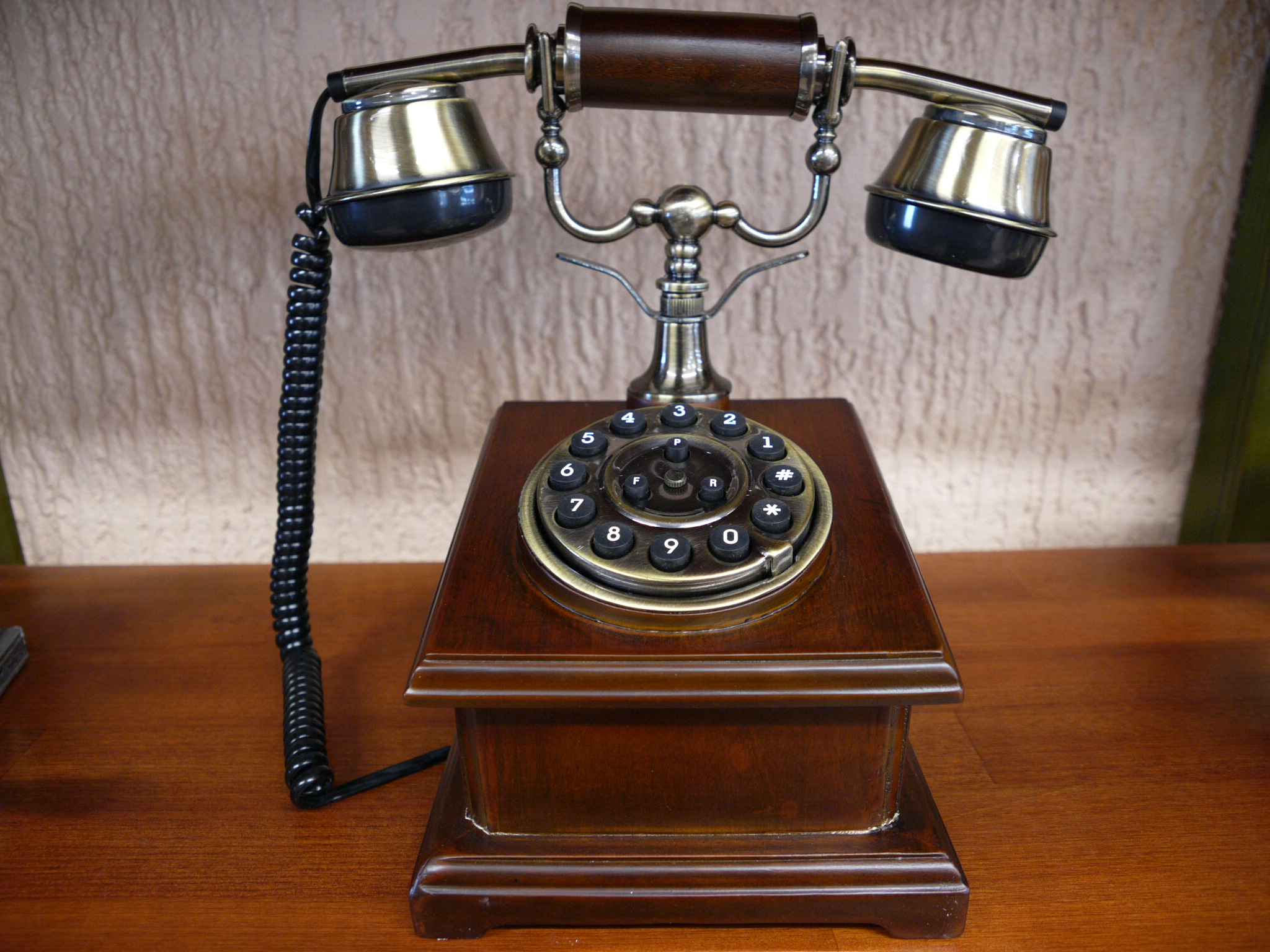 Reproducción teléfono antiguo cuadrado, fabricado en madera color nogal y metal dorado envejecido, con unas medidas de 24 cn. de alto por 25 cm. de ancho. Totalmente compatible con las líneas analógicas actuales, funciona directo a la línea de teléfono.