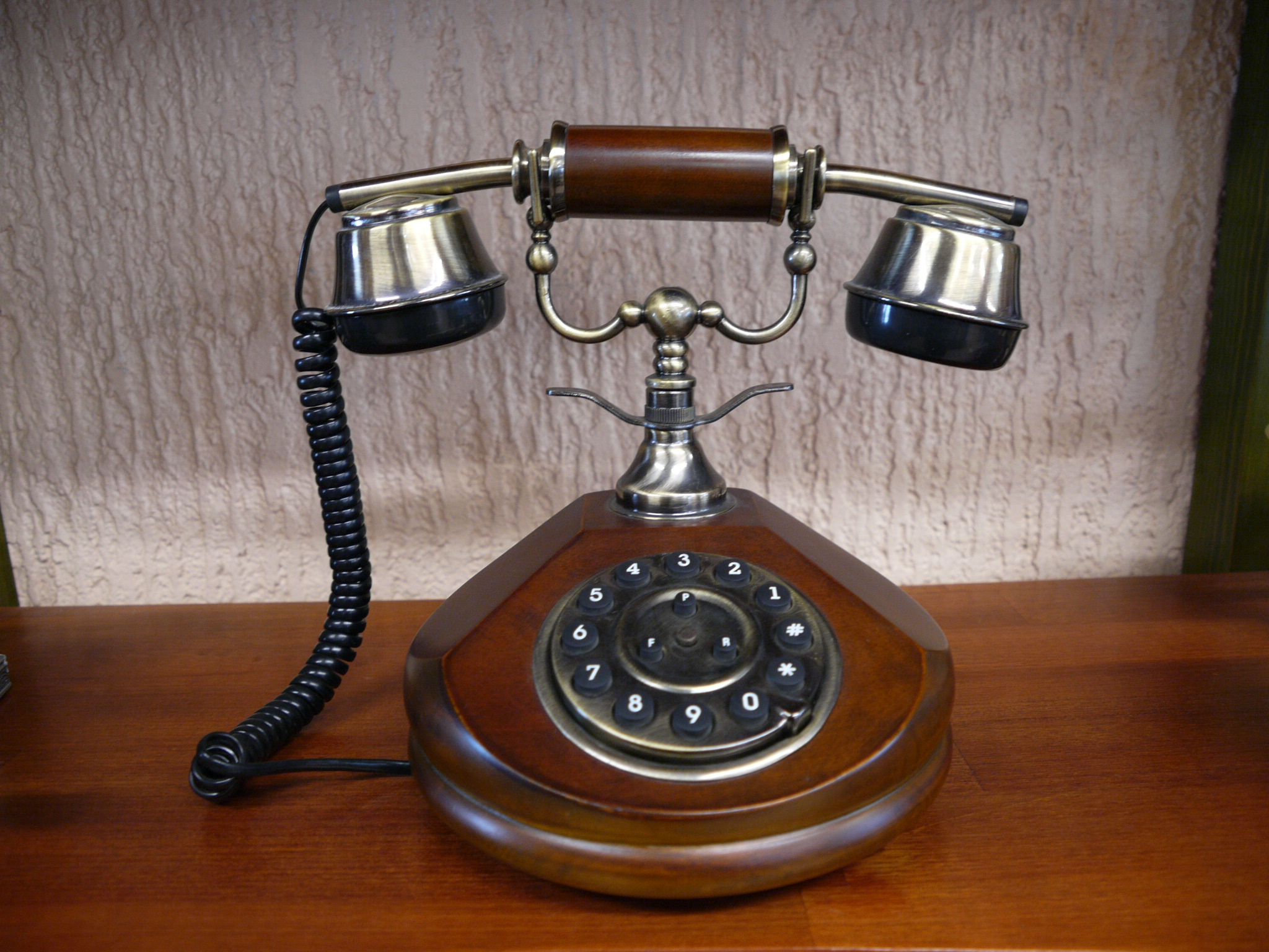 Rreproduccion teléfono antiguo, fabricado en madera colr nogaly metal dorado envejecido, con unas medidas de 21 cm. de alto por 25 cm. de ancho. Totalmente compatible con las líneas analogicas actuales, funcionamiento directo a la línea de teléfono.
